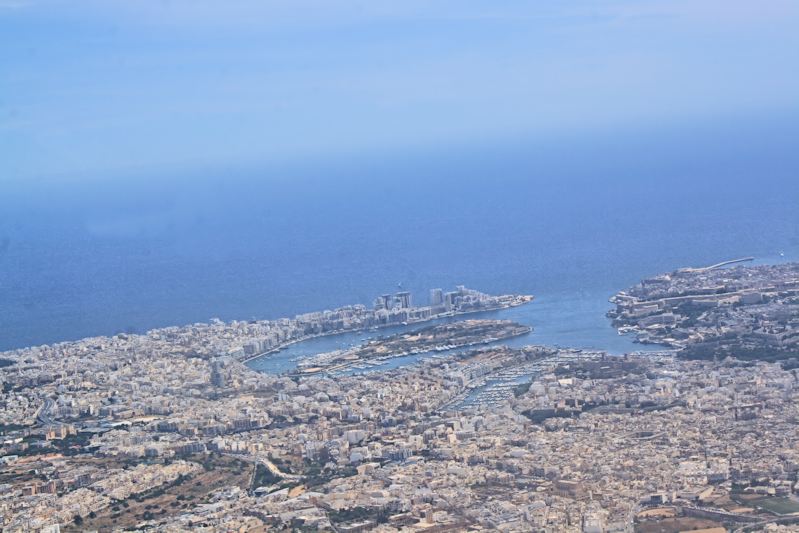 Aerial shot of Sliema, Manoel Island and Valletta as we climb out